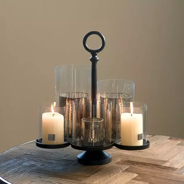 Houder voor 6 windlichten in verschillende hoogtes en breedtes.