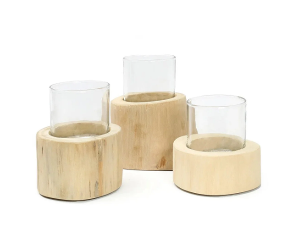 Het Candle Trio in prachtig lichtgekleurd teakhout is een set van 3 die een prachtig cadeau of een opvallende presentatie vormen wanneer ze worden gegroepeerd of afzonderlijk worden gebruikt op verschillende plekken in huis. We houden van het bleke, natuurlijke gevoel van het hout.