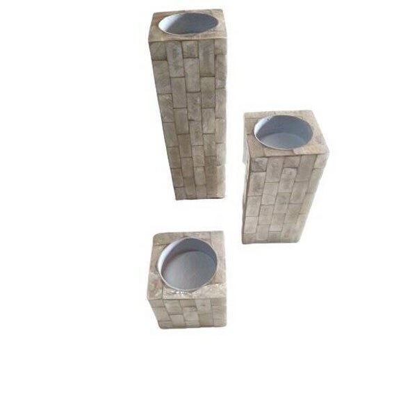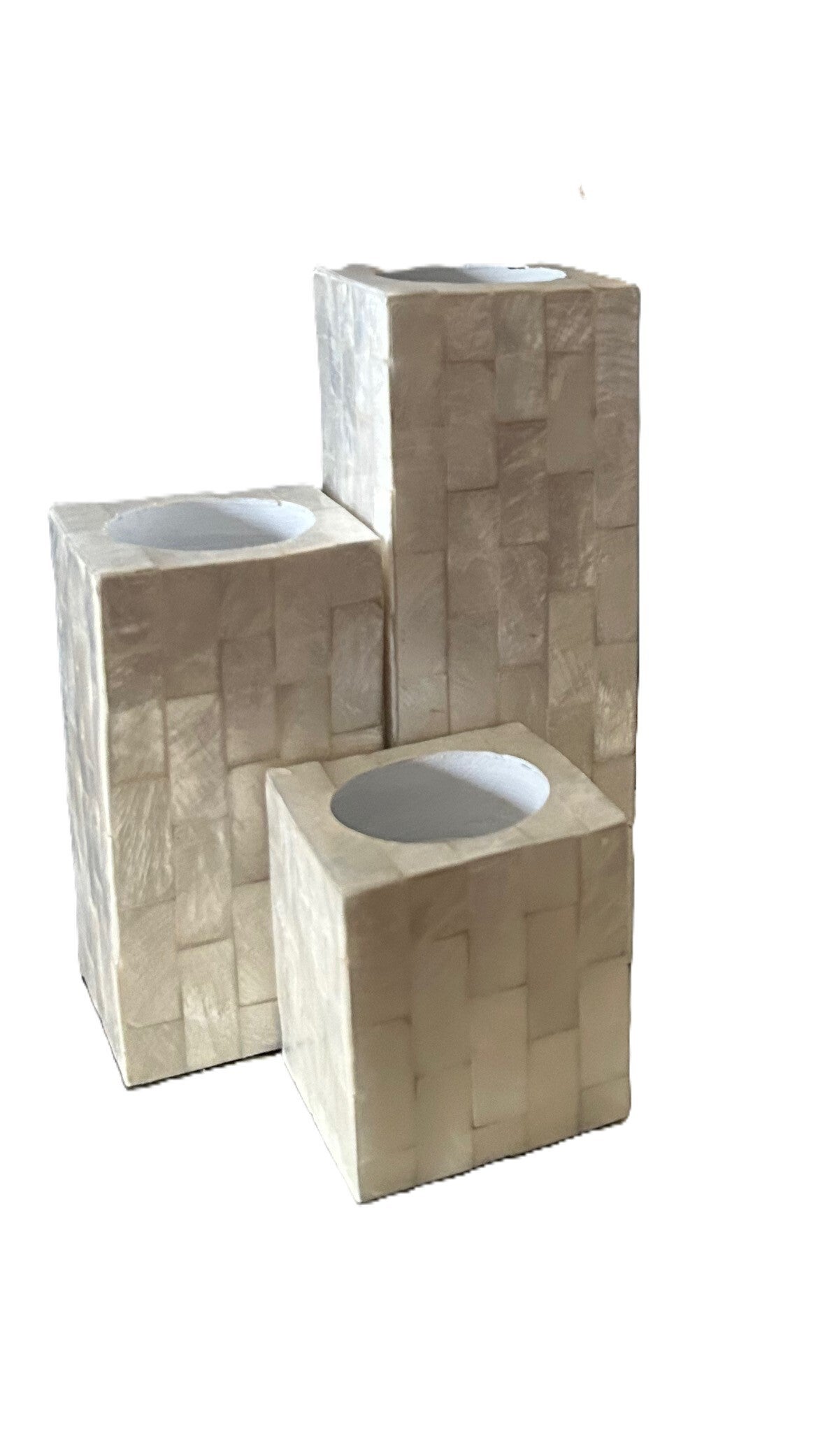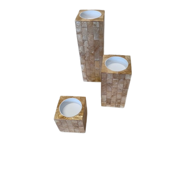 Set van 3 theelichthouders.Gemaakt van resin ingelegd met stukjes schelp.Hoogte: 16, 11 en 6 cm.Doorsnee: 5 cm.
